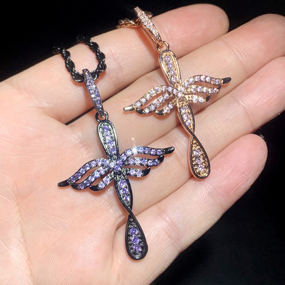 国境を越えた新しい天使の翼十字架紫色のピンクのジルコンは欧米で流行しているヒップホップネックレスのアクセサリーをはめ込んでいる