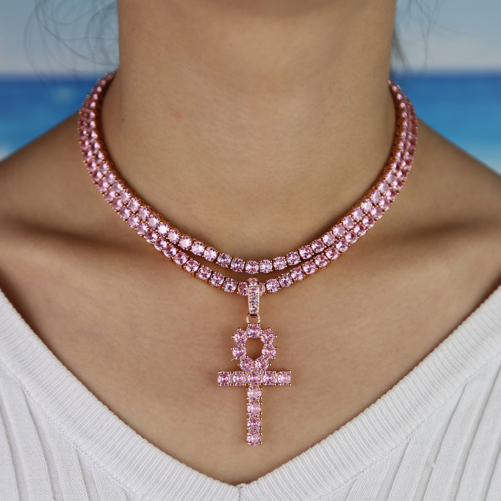5mmピンクジルコンクロスペンダントテニスチェーンレディースヒップホップネックレスtennis chainクロスボーダー新品