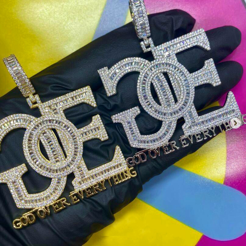 欧米貿易新作、フルダイヤモンド文字GOE電気メッキヒップホップペンダント、15mmキューバチェーン対応メンズネックレス