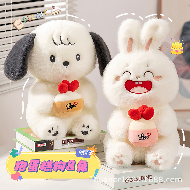 ケーキを抱いて子犬のウサギのぬいぐるみのぬいぐるみの犬のウサギの人形の子供は子供の誕生日のプレゼントをなだめます。