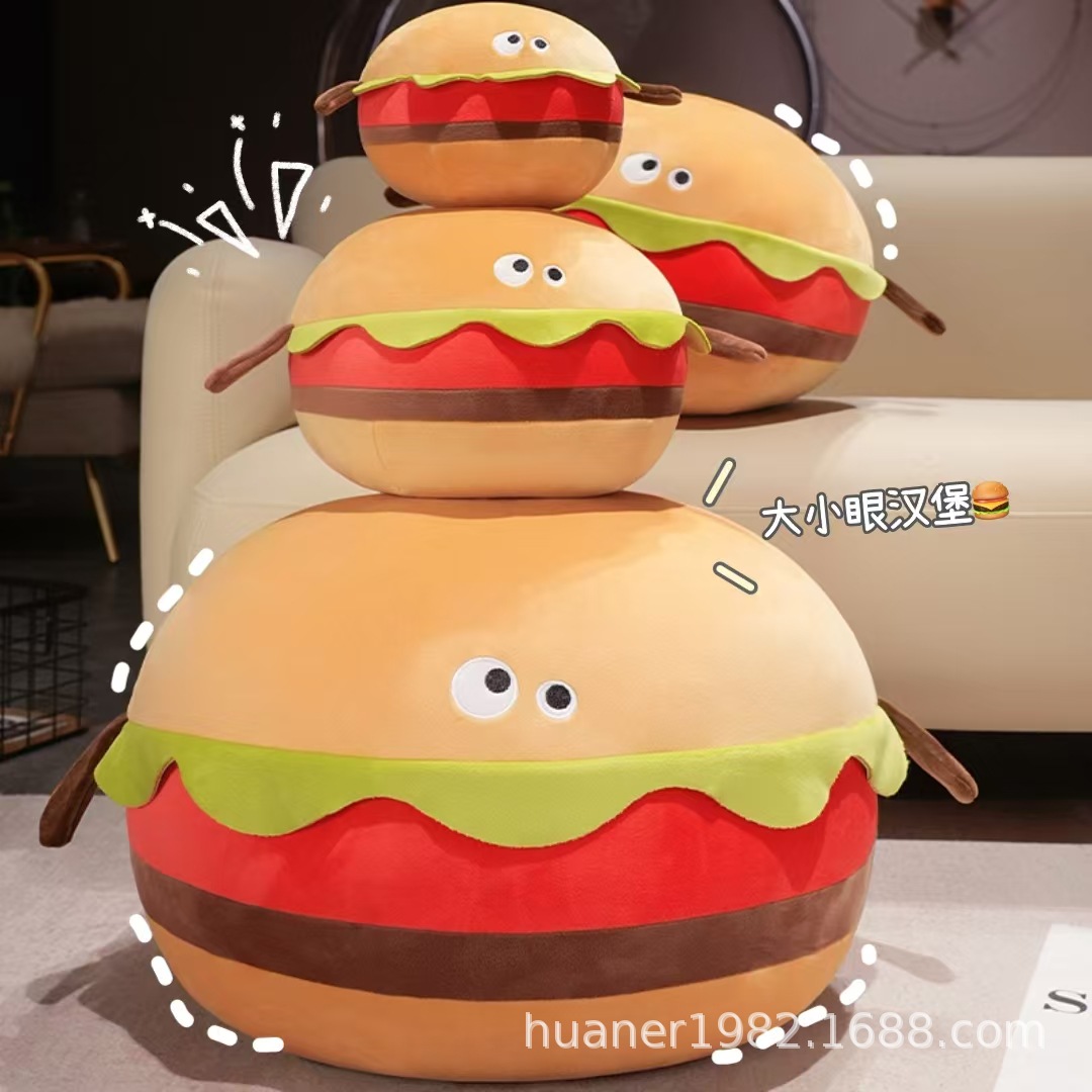 国境を越えてかわいい大きさの目がおかしいハンバーガーは枕のクッションの食べ物を抱いて寝て子供を抱いてプレゼントを食べます。