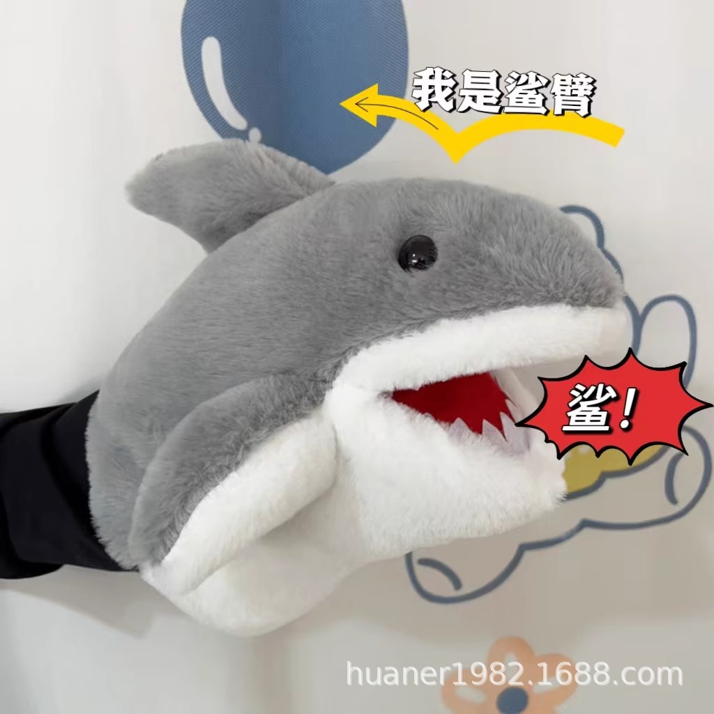 国境を越えて小さなサメの手の人形の人形の人形を責めることができます。人形は口を開けてぬいぐるみのサメの腕を整えることができます