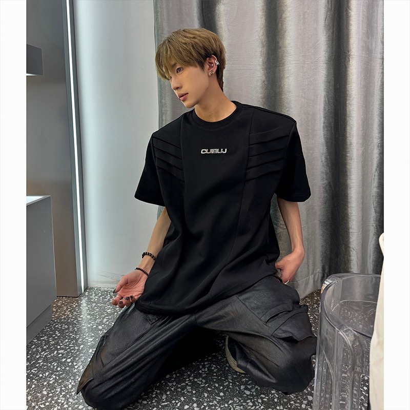 大衆高級感肩掛けtシャツ男性潮牌夏デザイン高街半袖小襟元アメリカ重ポンド半袖