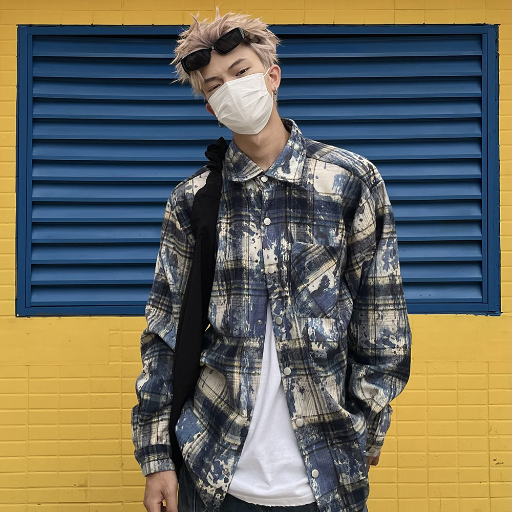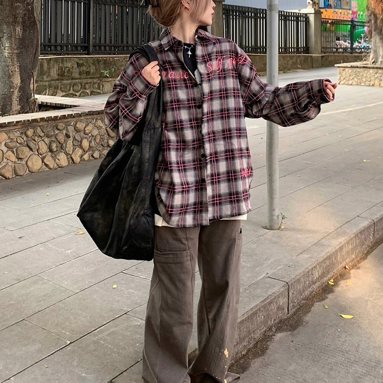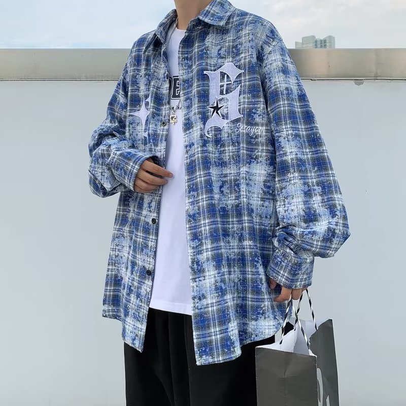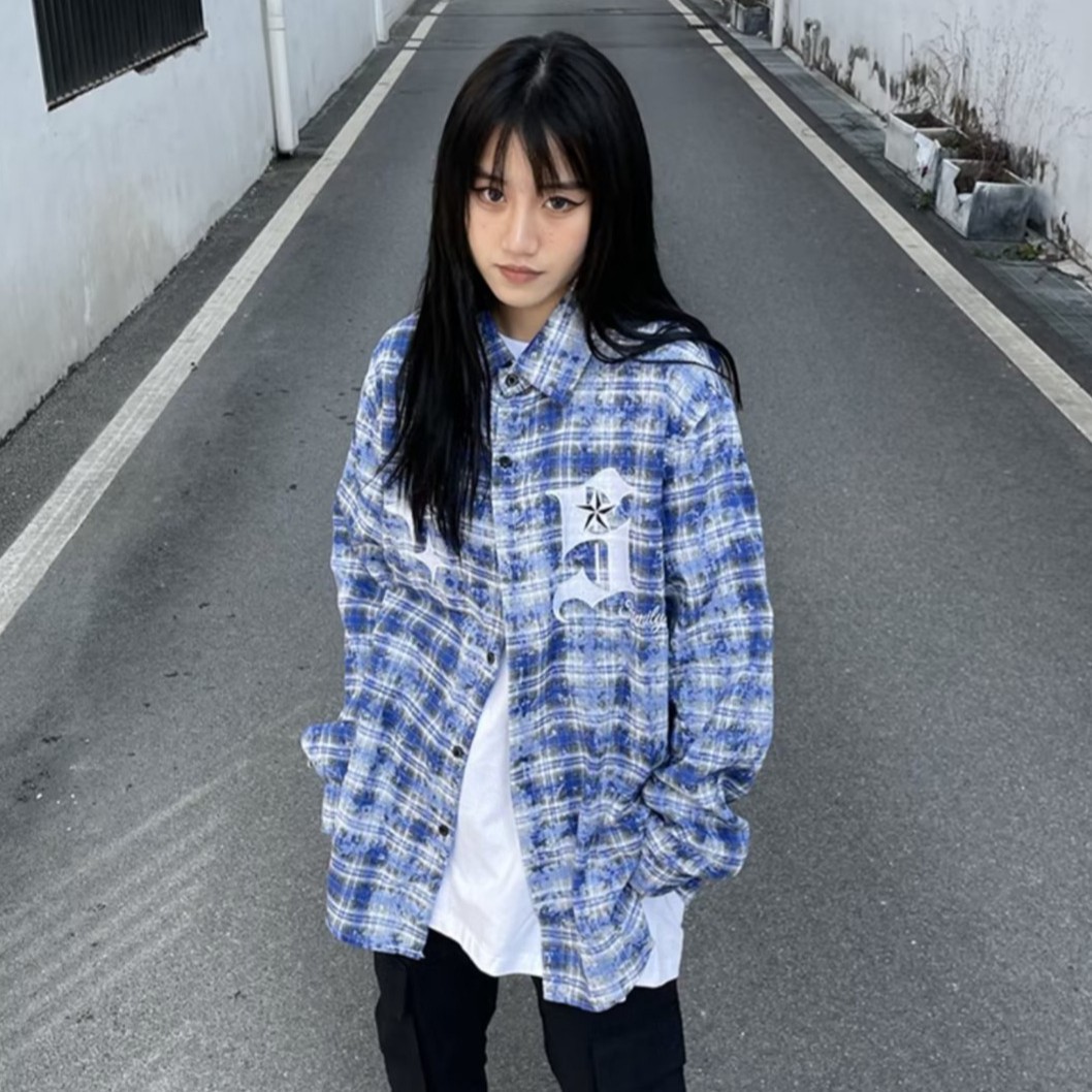 アルファベット刺繍染めアメリカの街頭の青い格子シャツコート男女カップルゆるいins潮牌上着
