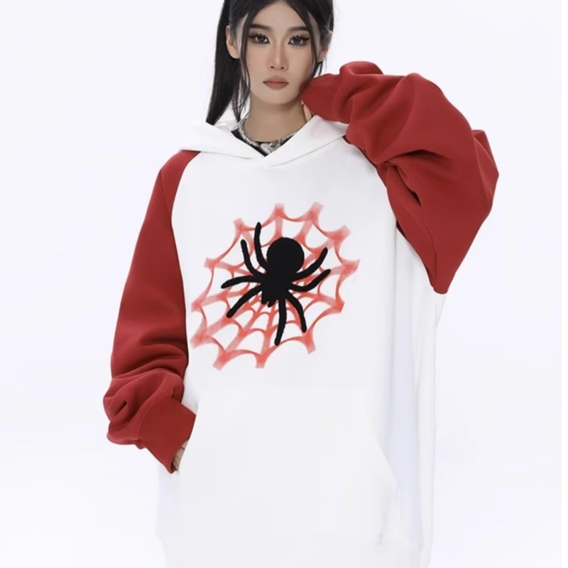 新型アメリカの蜘蛛のプリントと帽子の衛衣の女性秋冬の綿の複合レトロな薄いタイプの娘の蜜の装の衛衣