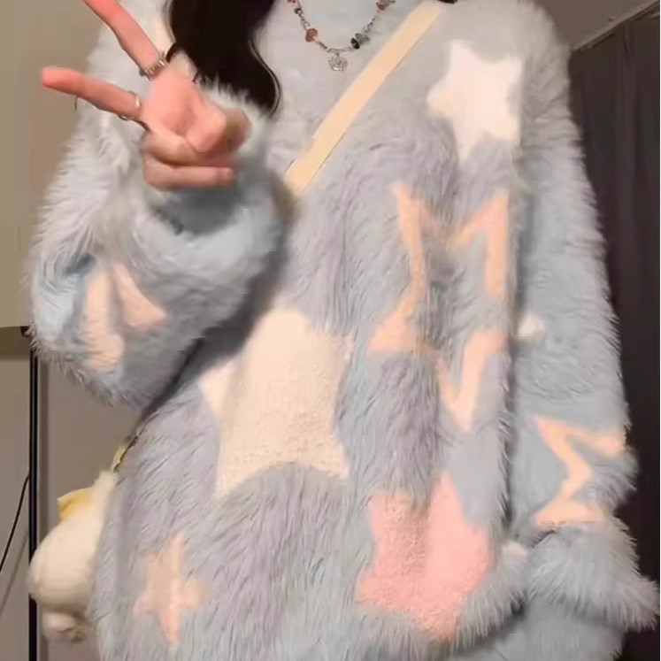 星の怠惰な風の青い柔らかいモチモチのセーターの女性の秋冬の韓国版の頭の丸首はゆったりしていてやせているニットの上着の潮が現れます。