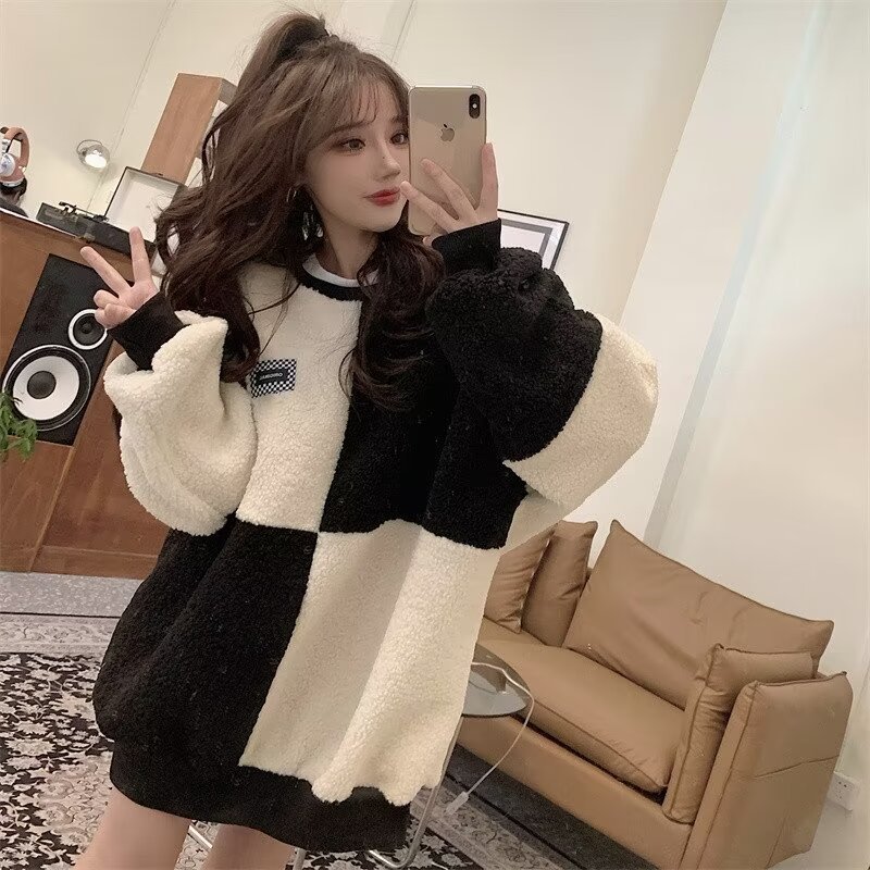 格子の子羊の毛のパーカーの女性の秋冬のゆったりしたinsの怠惰な風のbfのベルベットの厚い香港風のchi港の味のコート
