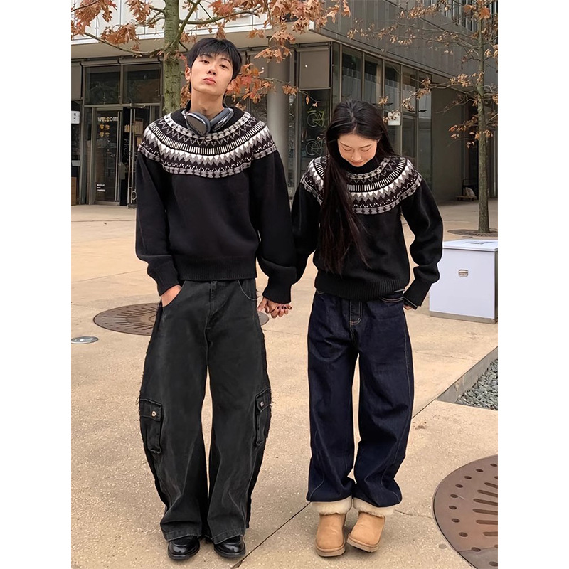 外国貿易2024カップルセーター秋冬新作レトロ小衆フェア島ジャカードプルオーバー丸襟ニット上着男