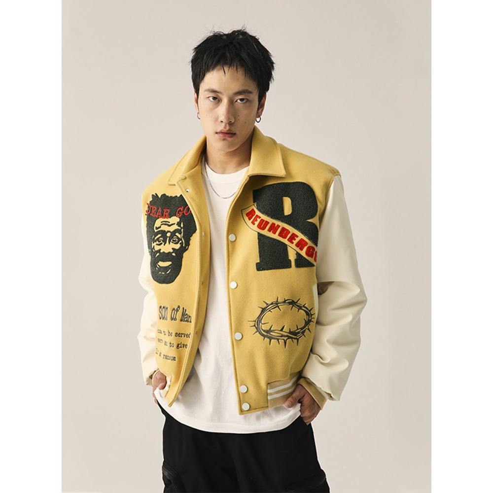 国境を越えた重いポンドのアメリカのレトロなつなぎ合わせの色の合わせの皮のタオルの刺繍の野球の服のゆったりしている綿のジャケットの男性を挟みます。