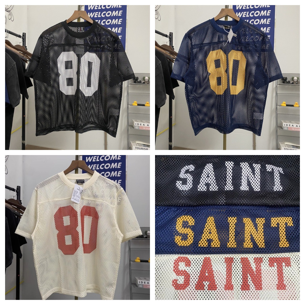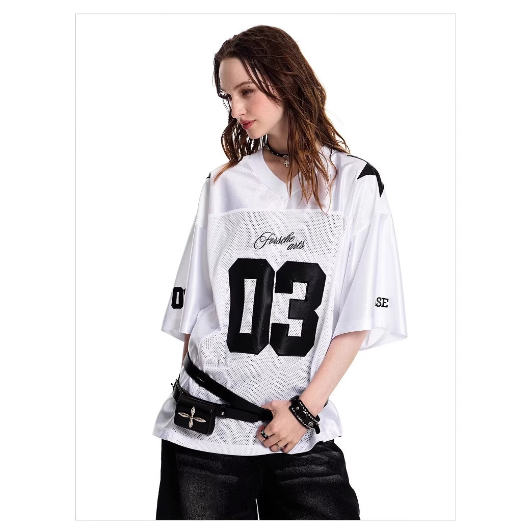 クロスボーダーのトレンディなブランドスターと同じスタイルの80プリントラグビーユニフォーム中空メッシュルーズメンズとレディース半袖Tシャツトップス男性用