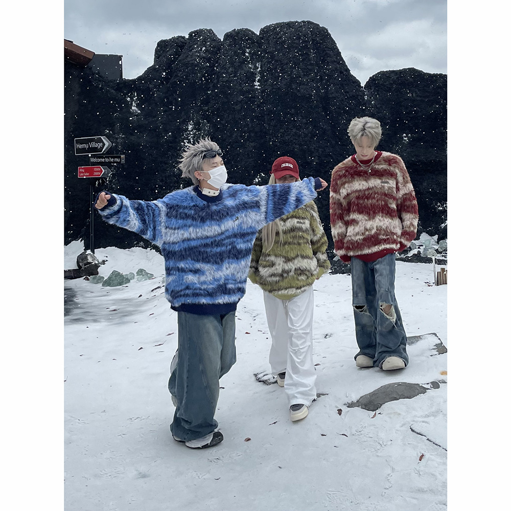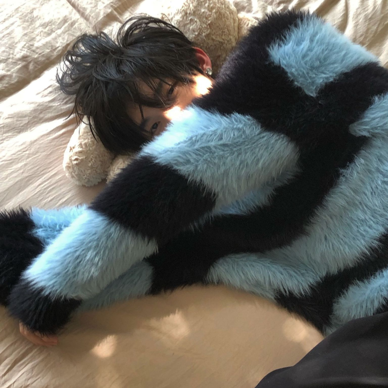アメリカの青いストライプのミンクのセーターの男性のゆるいニットの秋冬のoversizeの馬の毛のニットの中の長いタイプ