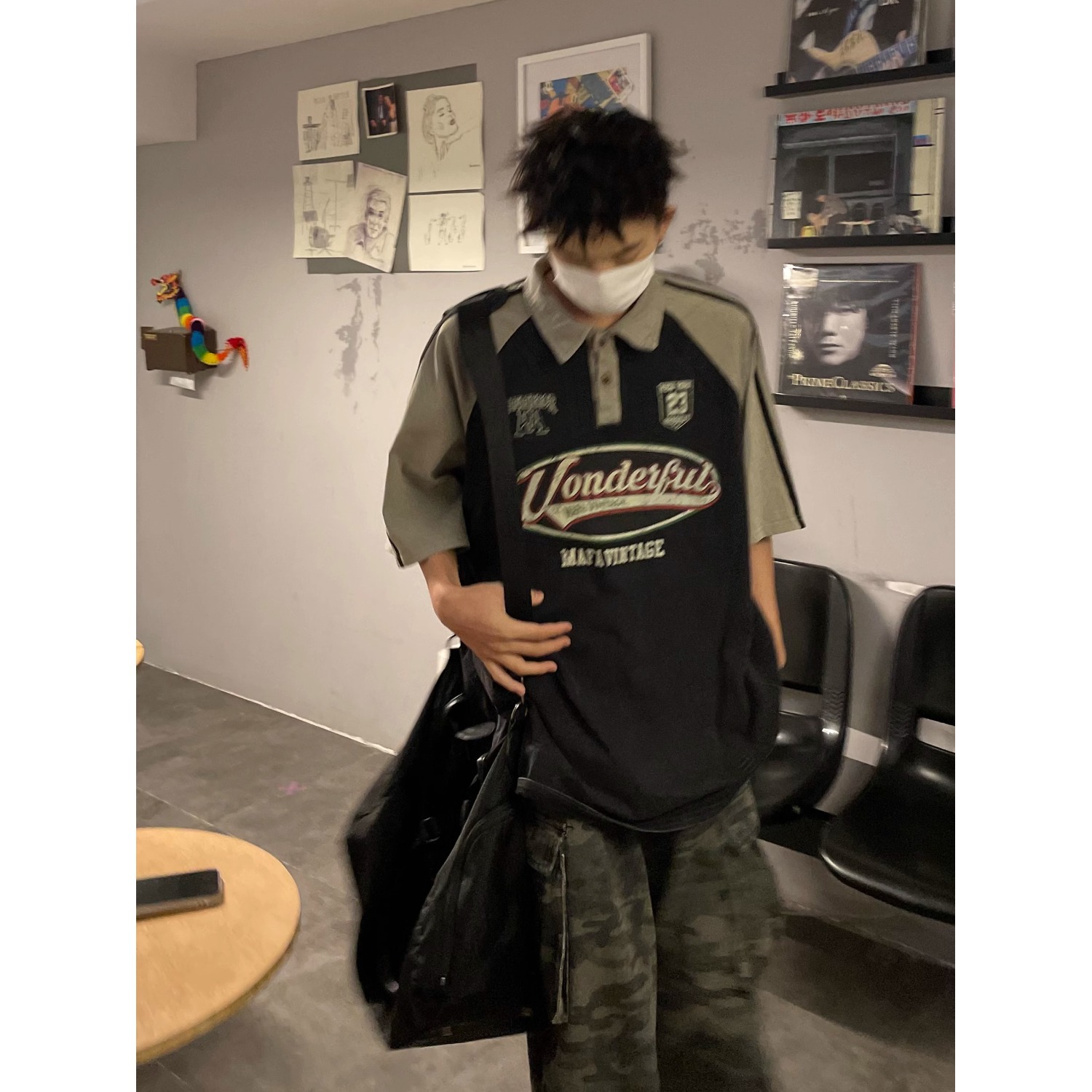クロスボーダー夏の新しいルーズアメリカンレトロストリートカレッジスタイルポロカラー半袖Tシャツトップス男性とティーンエイジャー向け