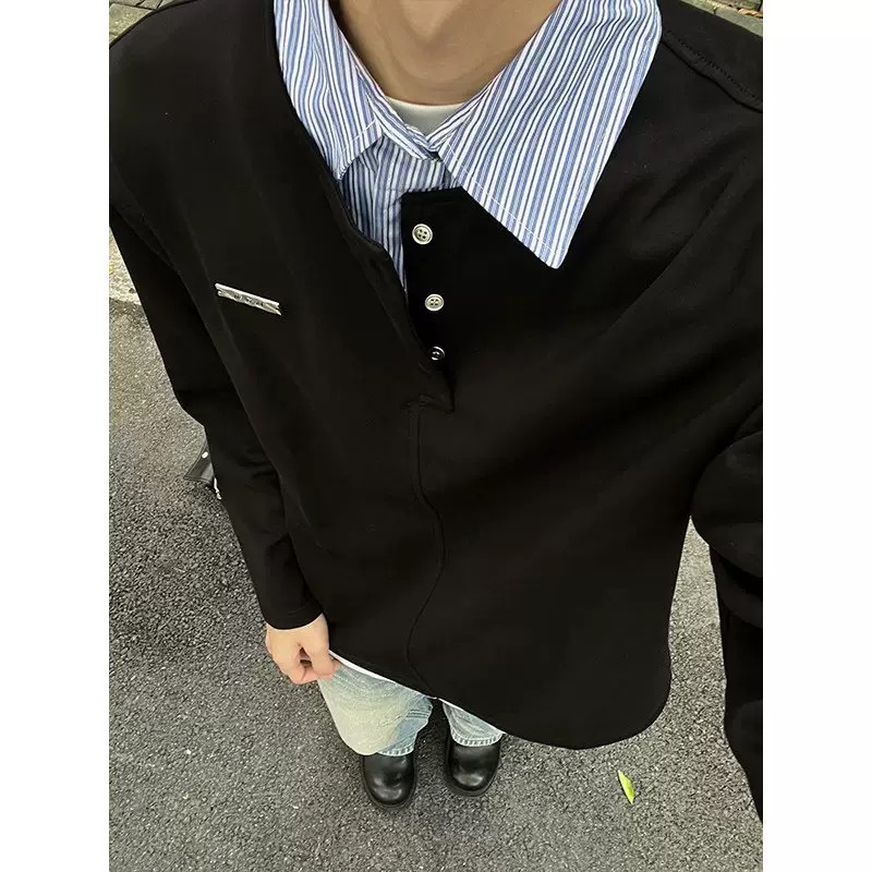 外国貿易の韓系学院風の大衆は偽の2つの衛衣の秋のゆったりしたpoloの襟の長袖の高級感のシャツをつなぎ合わせます。