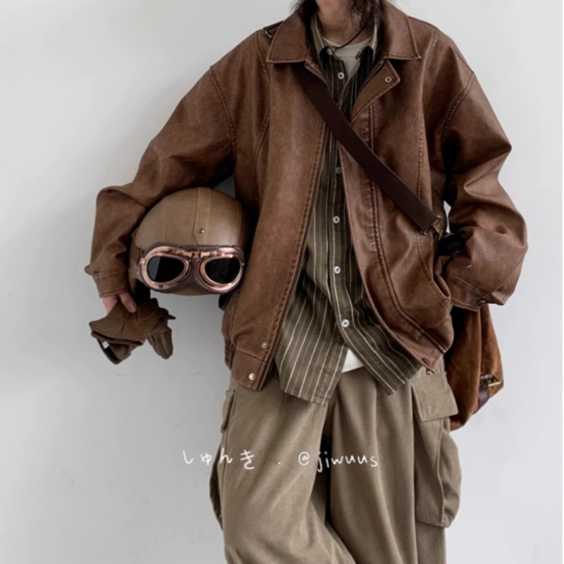 卸売り2025春秋のアメリカのレトロなカレー色の機関車の皮の服の男子学生のINS風のpu皮のジャケットのコートの潮