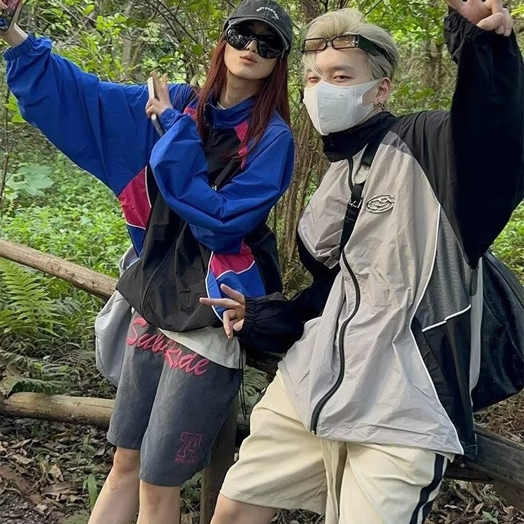 クロスボーダー卸売レトロアメリカン薄い日焼け止め服男性と女性のためのトレンディなブランド春と夏のスプライシングカップル屋外速乾性ジャケット