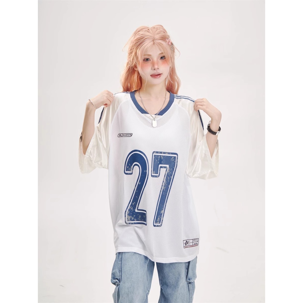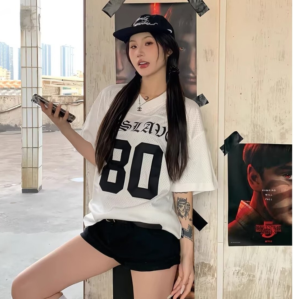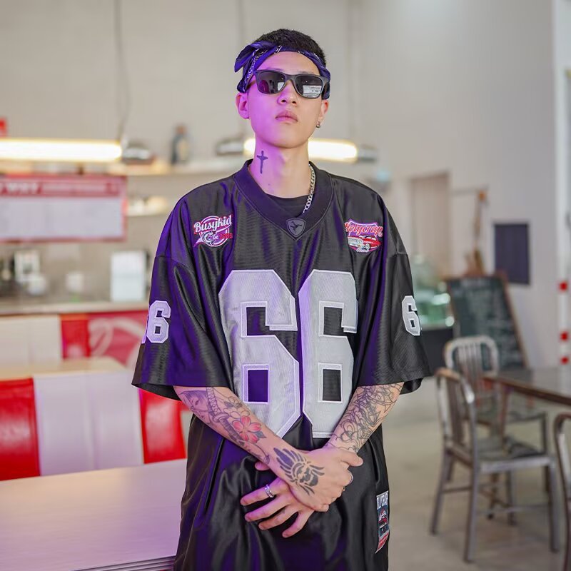 クロスボーダーヒップホップスポーツスタイルジャージレディースサマーカレッジスタイルメッシュラグビー半袖Tシャツルーズトップ男性と女性用