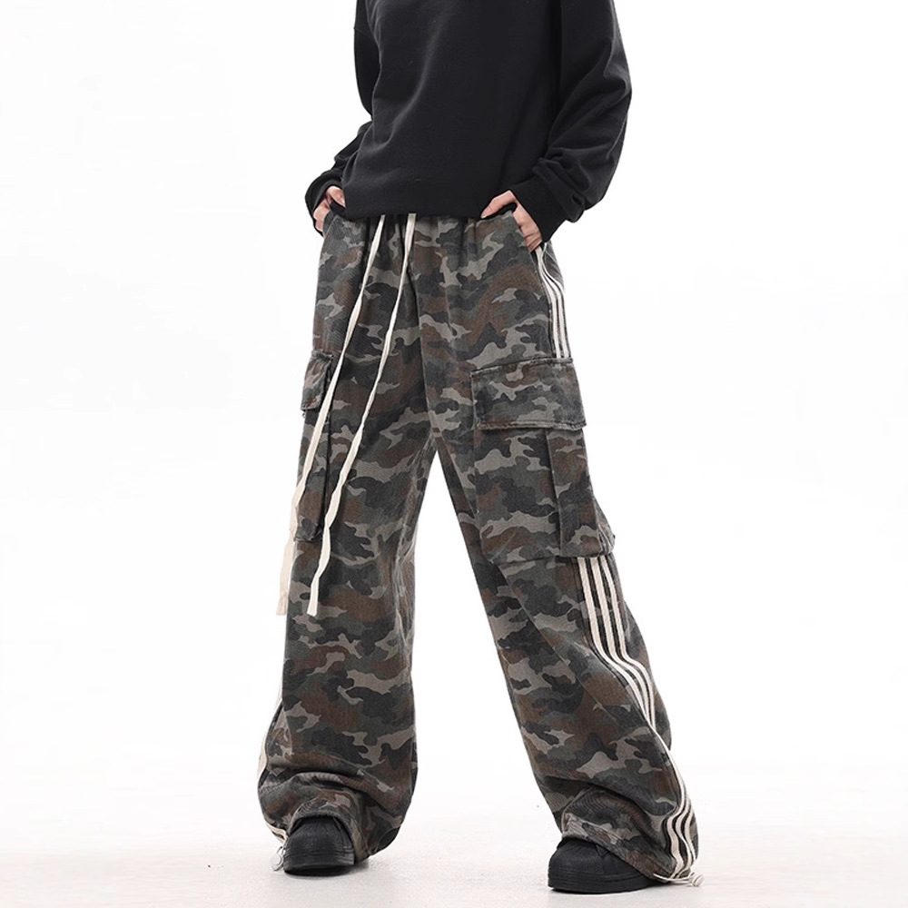 クロスボーダーアメリカンレトロストレートストライプ迷彩オーバーオール男性と女性のための大きなポケットニュートラルスタイルルーズワイドレッグカジュアルパンツ