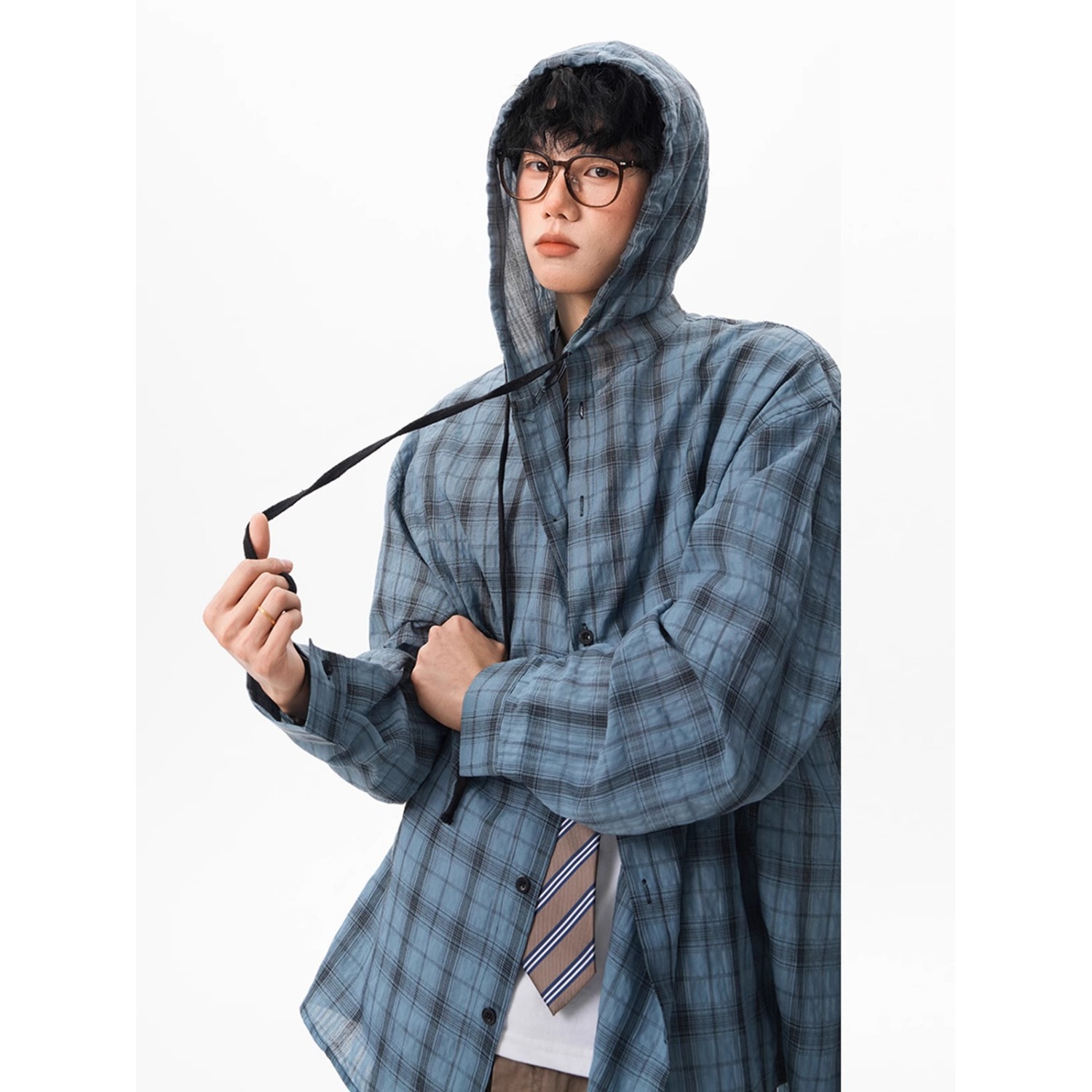クロスボーダーブルーチェック柄シャツ男性と女性のための夏のアイスシルク速乾性フード付き日焼け止めジャケット長袖シャツカーディガン付き