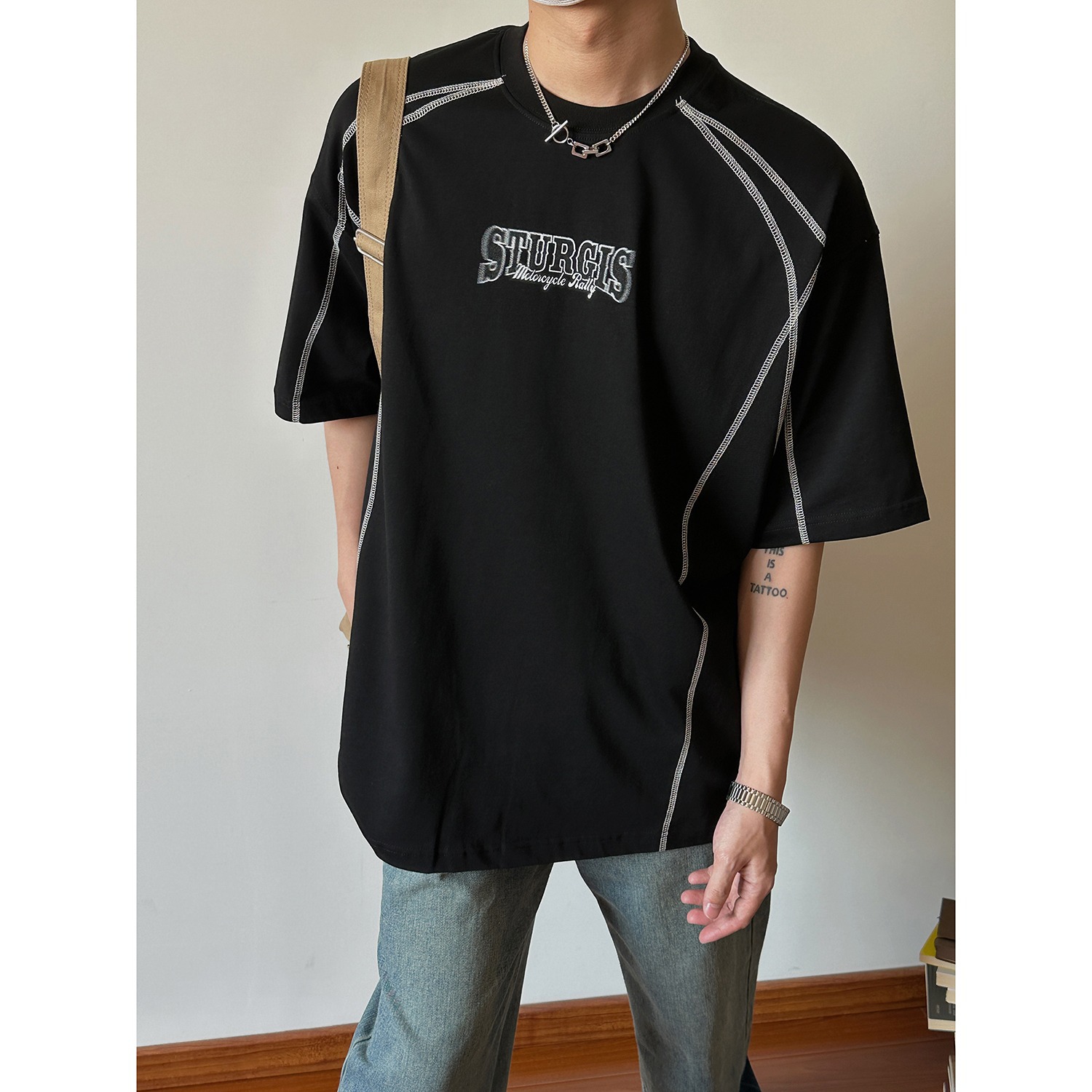卸売 2025 夏アメリカン香港スタイルレトロラインデザインハイストリートハンサムラウンドネックプリントカップル Tシャツ
