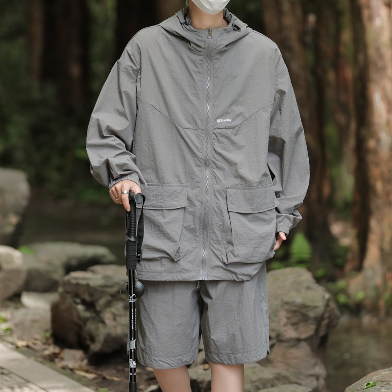 日焼け防止服フード付き男性と女性のための同じスタイルのウインドブレーカー夏薄いアイスシルク通気性抗 UV 日焼け防止服スーツ男性用