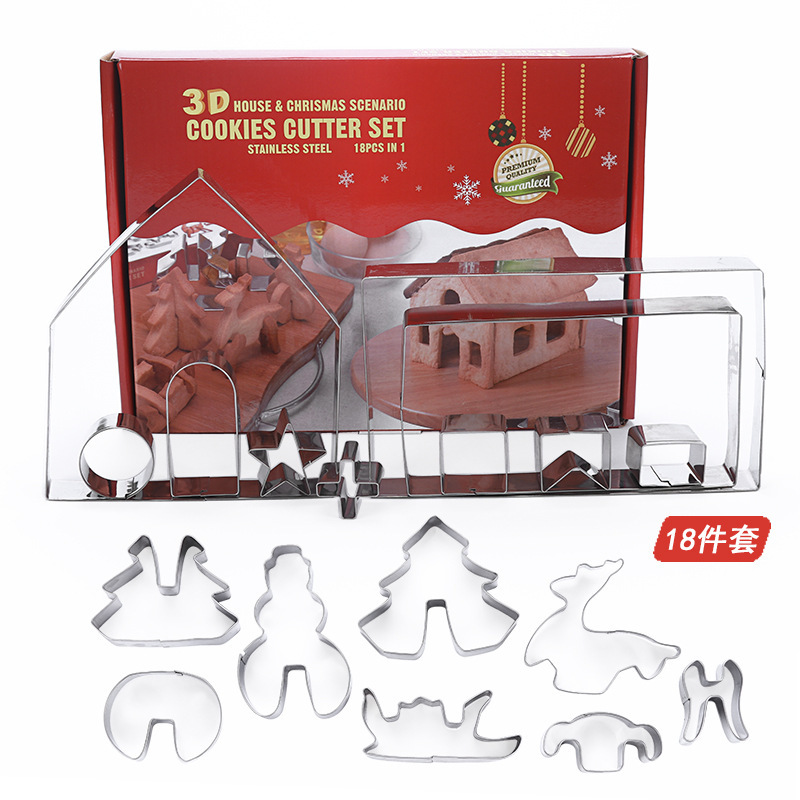 クロスボーダー热い贩売クリスマス18ピースセットステンレス3d立体クッキー金型ジンジャークッキーハウスクッキー金型