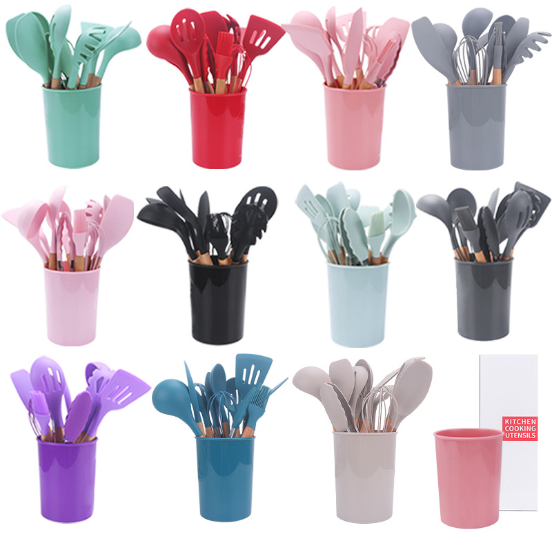 国境を越えた現物木柄シリカゲル調理器具11/12点セット調理器具バレルカーキ色黒色無粘着鍋調理道具