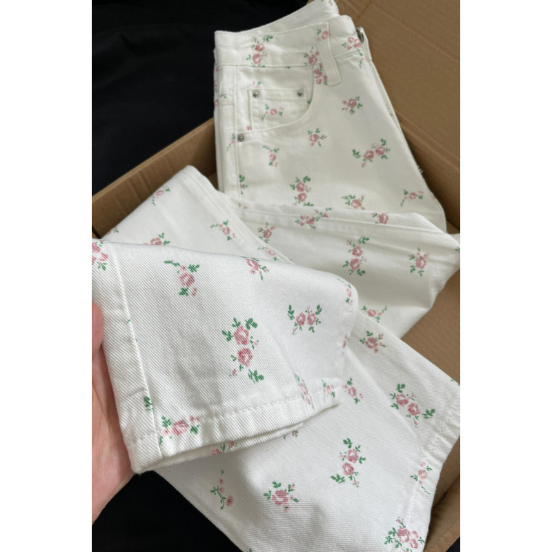 花柄ストレートジーンズレディース夏薄手ゆったりハイウエストカバーフレーム痩身カジュアルワイドレッグワイドレッグパンツ工場
