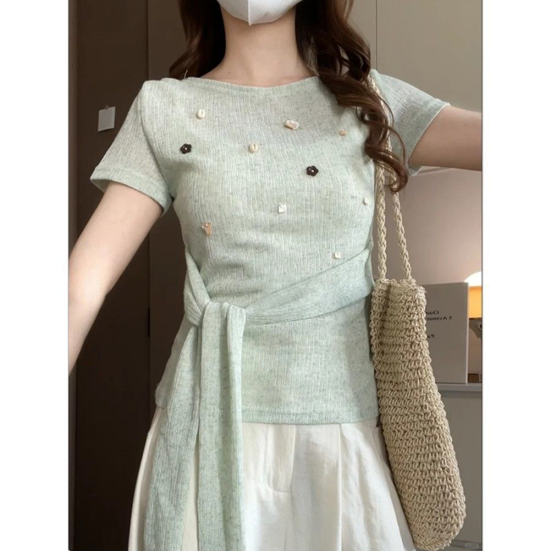 デザインされたスプライススパンコール半袖ボトムTシャツ、女性用夏ストラップスリム韓国スイートラウンドネックスリミングトップ