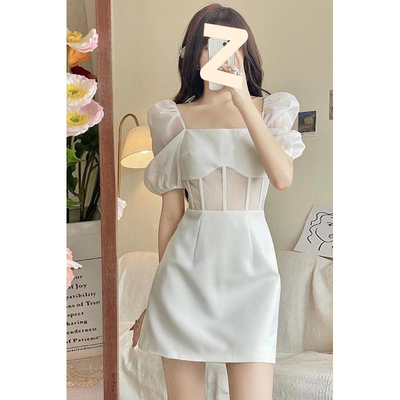 気質白いドレスフレンチパフスリーブスクエアネックフィッシュボーンメッシュAラインスカート社交パーティードレス夏ストレートヘア