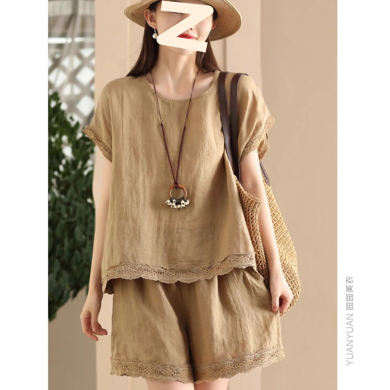夏の高級綿とリネンのカジュアルスーツレディースファッションルーズTシャツワイドレッグショーツ無地2点セット1点直販