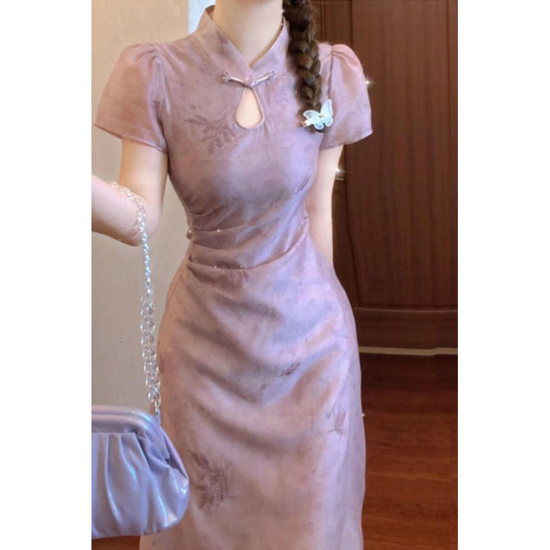 紫色のプリント改良されたチャイナドレス女性の夏の気質ハイエンドの新しい中国風のウエストロングスカートクロスボーダー