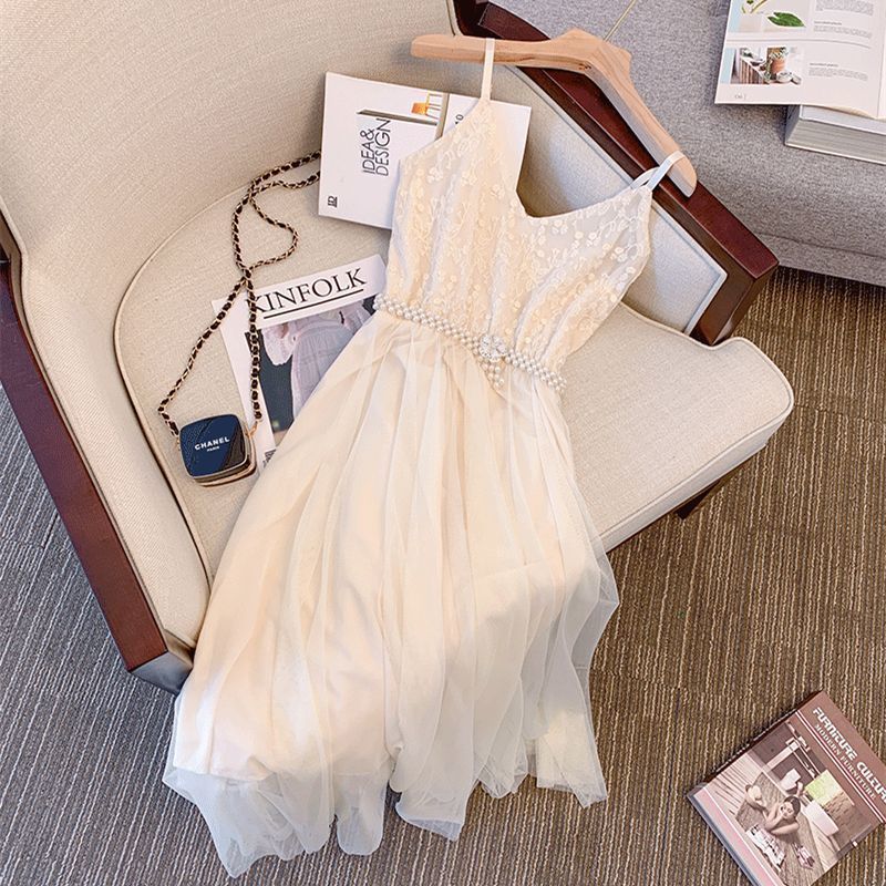 サスペンダードレス 2025 夏の娘の気質妖精スリム痩身ウエストメッシュ休暇ロングスカート工場