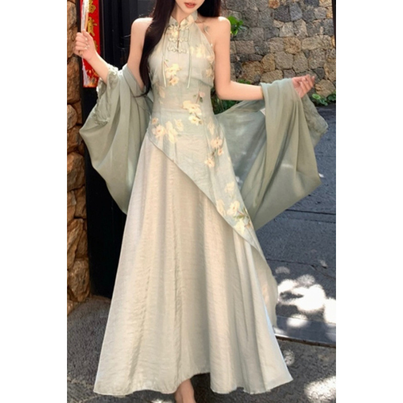 夏の新しい中国風スーツ、優しく明るい色のプリントノースリーブホルターネックチャイナドレス、アンティークカーディガントップ、ミドル丈スカート