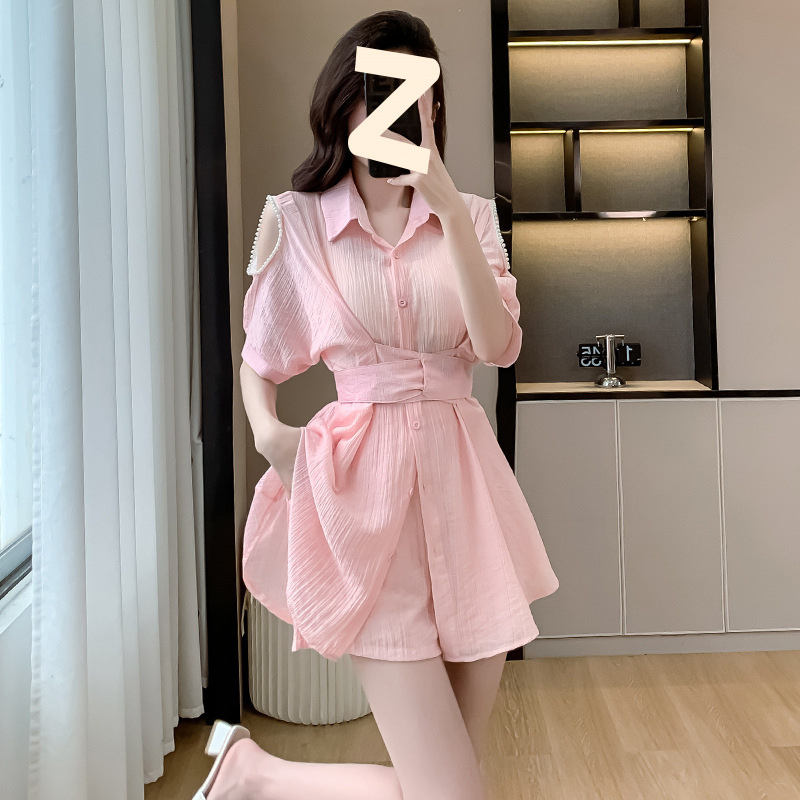 シングル/セット 2025 夏スリムパールオフショルダーシャツとショートパンツのツーピースセット日焼け止めデザイントレンディ
