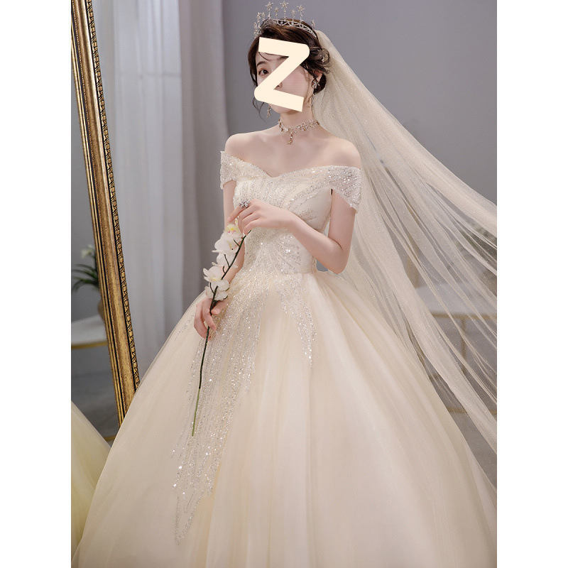 メインウェディングドレス 2025 花嫁気質ワンショルダーシャンパンカラー高級宮殿スタイルフレンチプリンセス秋冬ライトガーゼ直販