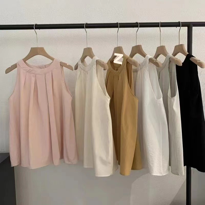 ラウンドネックノースリーブベストトップ胸プリーツ無地レトロ甘いベビードールシャツ女性のための 2025 夏の気質