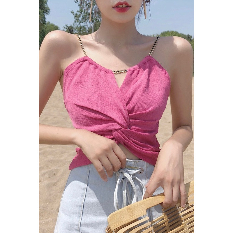 女性用ベストサスペンダー、夏のシックでセクシーなハイウエストショートへそ出しトップ、多用途のチェーンプリーツアウターボトリングシャツ