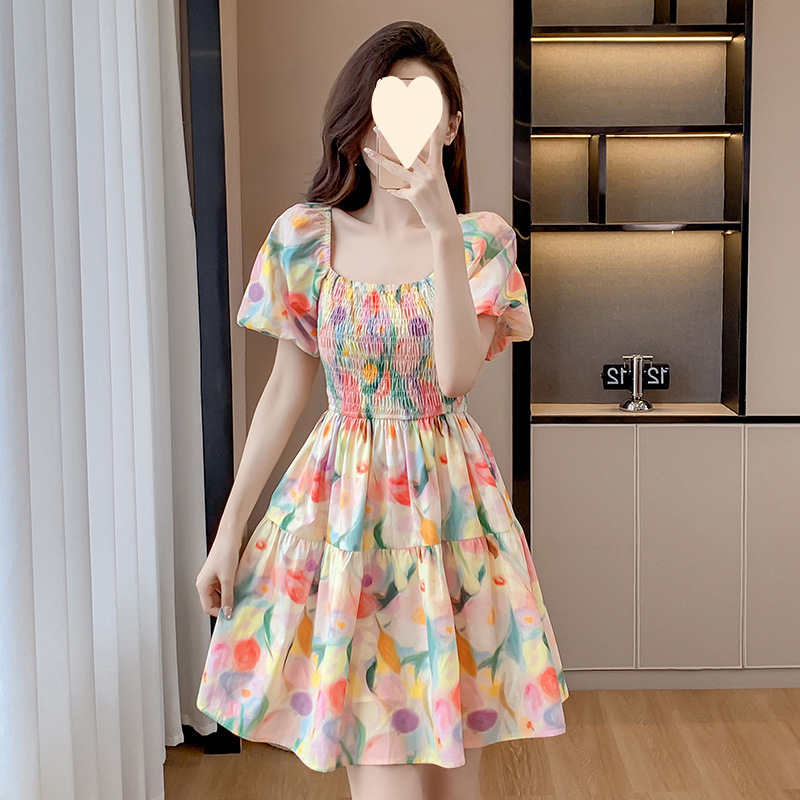 2025 スクエアネック夏ウエスト新しいフランス油絵気質ドレス花柄バブル甘いスカート直販