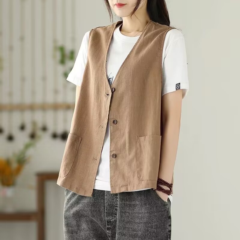 無地コットンとリネンの女性用ベスト、春と夏の薄手の文学的で芸術的なルーズレトロなシングルブレストリネンベスト、女性用アウタートップ