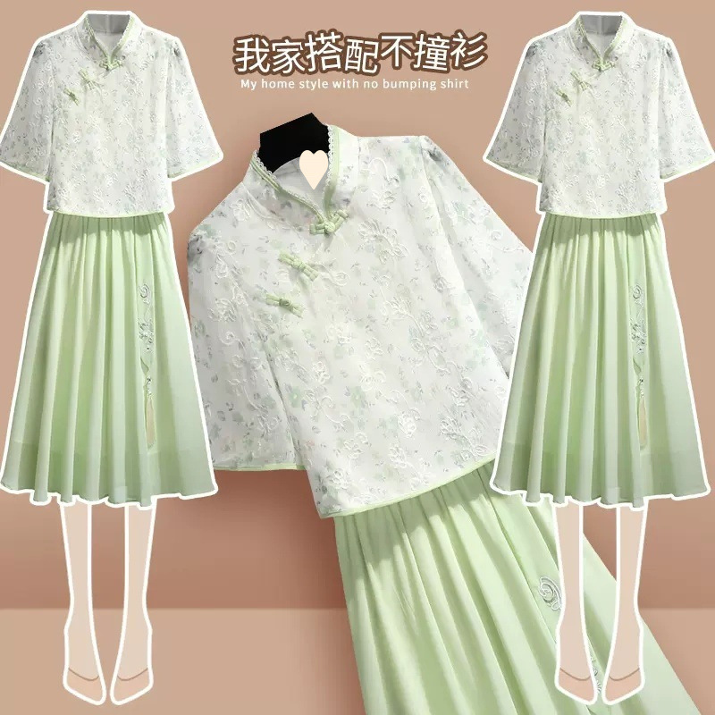 新しい中国風のライトナショナルスタイルの女性用夏服漢服改良版チャイナドレスツーピース花柄スカートストレートヘアメーカー