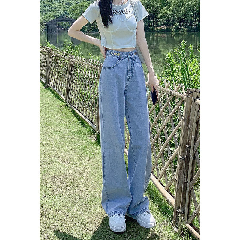 女性用ハイウエストジーンズ、ストレートレッグ、ルーズ、2025春秋新作、明るい色、スリム、小柄な人向けのフロアレングスワイドレッグパンツ