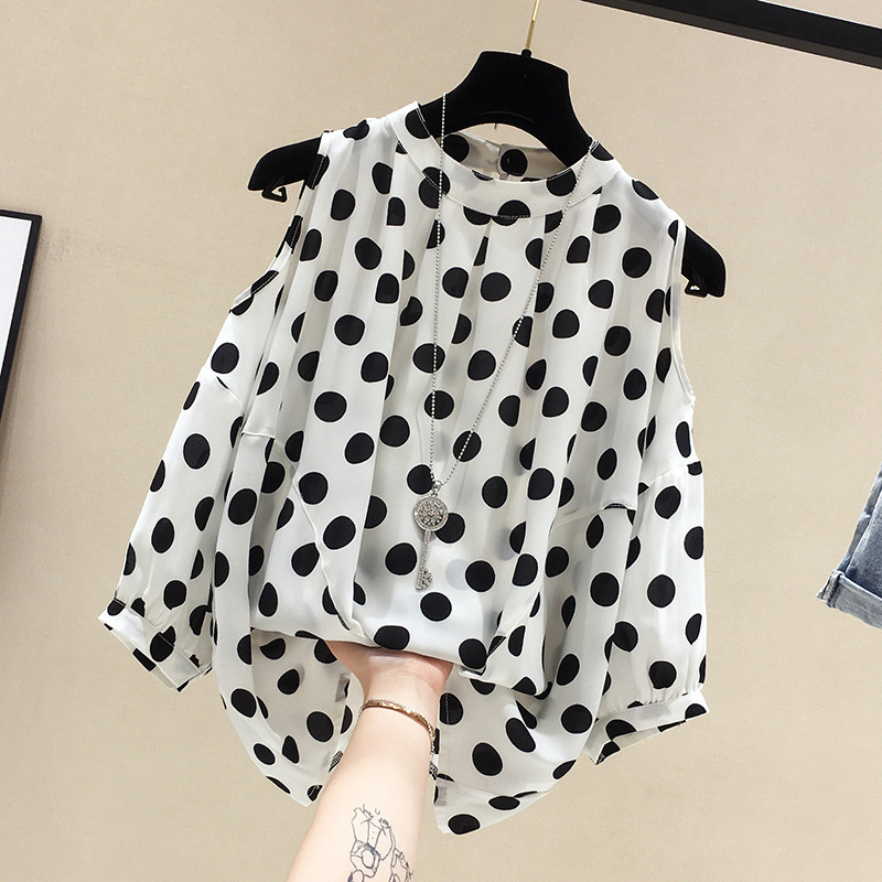 プラスサイズの女性の夏の新しいスタイルの太った女の子のゆったりとした痩身お腹カバートップ水玉オフショルダー半袖シフォンシャツ