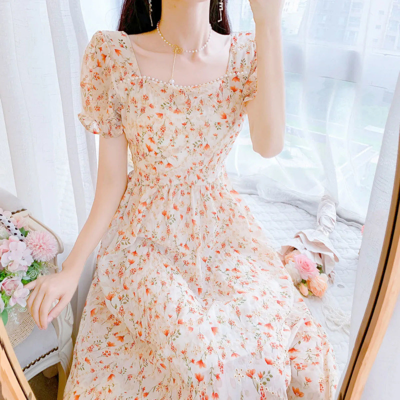 小さな新鮮な花柄ドレス 2025 夏の新フレンチパフスリーブスクエアカラーウエスト痩身妖精スカート