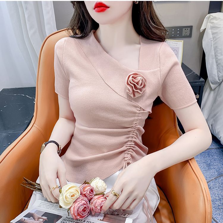 タロパープル立体花ニット半袖Tシャツレディース夏新作スリムスリットショートスクエアネックスイートトップ