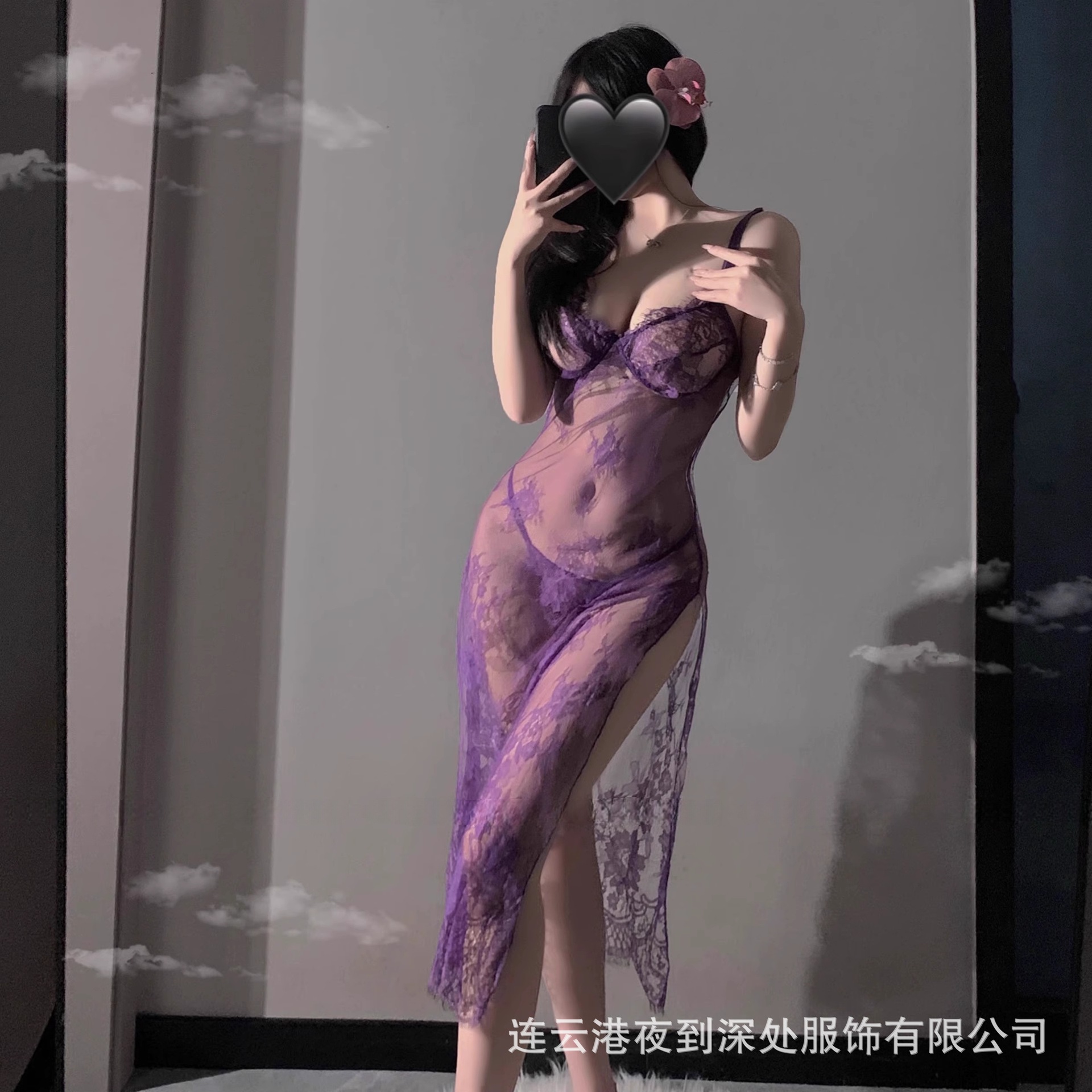 夜から奥までの趣味下着セクシーな紫色のストラップワンピース純欲レース透視パジャマ小胸制服女