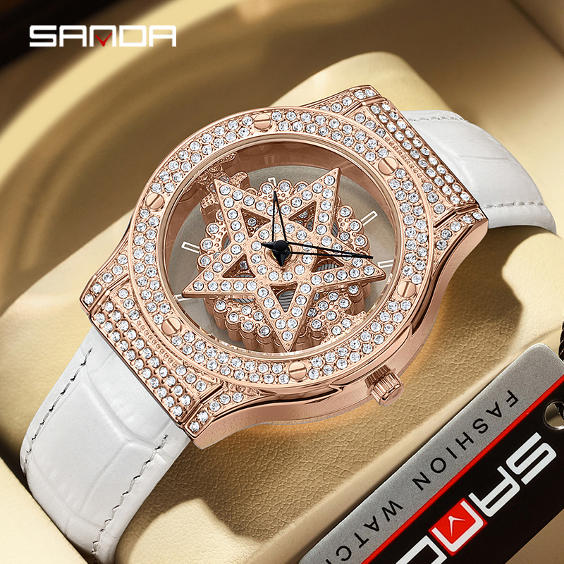 腕時計の女性の金の貿易の越境する五芒星の輸入の石英の時計の回転の透かし彫りの個性の腕時計の女性の軽い豪華なのはドリルのベルトを入れます。