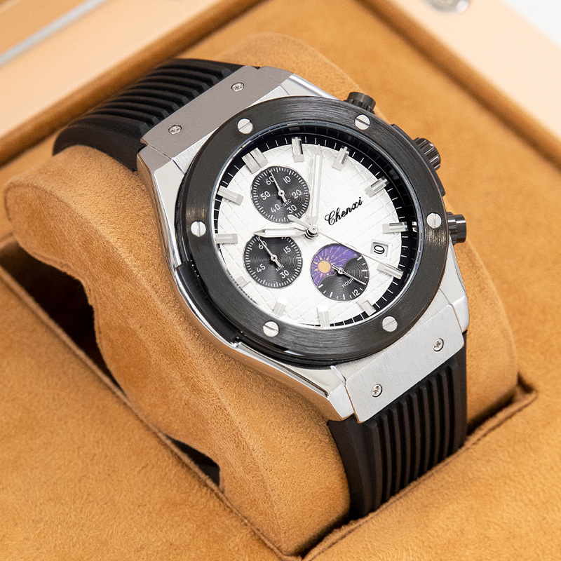 腕時計の男性の多機能の真三眼六針の超薄の2024新型の夜光の透かし彫りのファッションの潮流は生放送して爆発します。