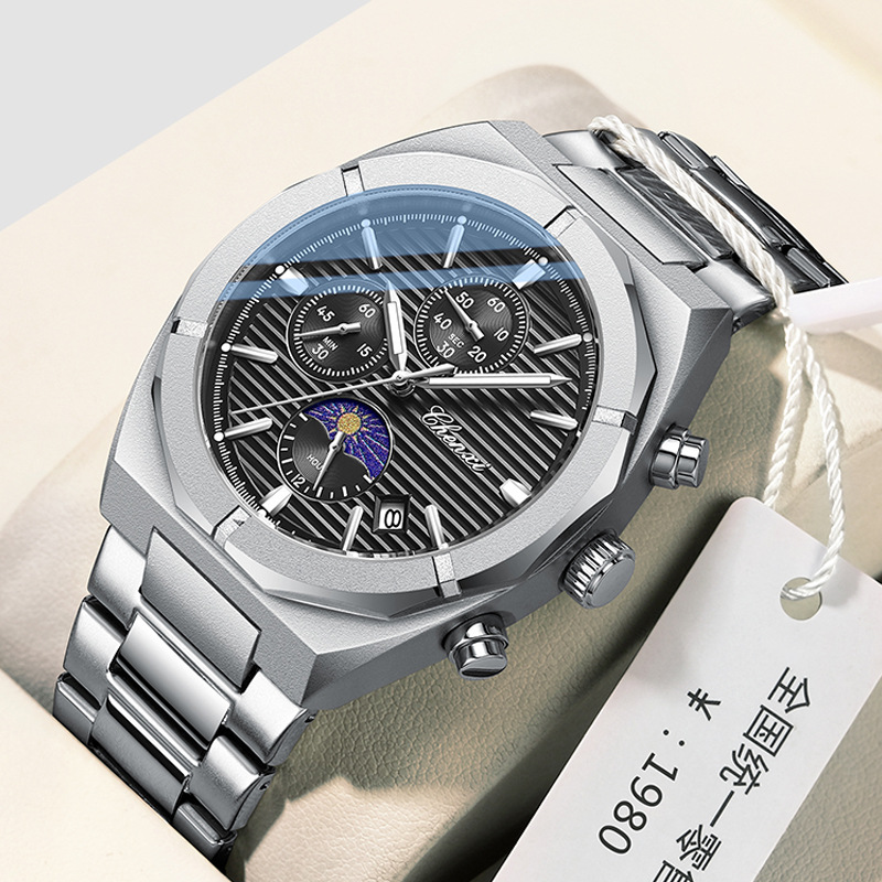 腕時計男型月相カレンダー石英時計時計太陽と月星ファッションシンプル鋼帯レジャー超薄2024新