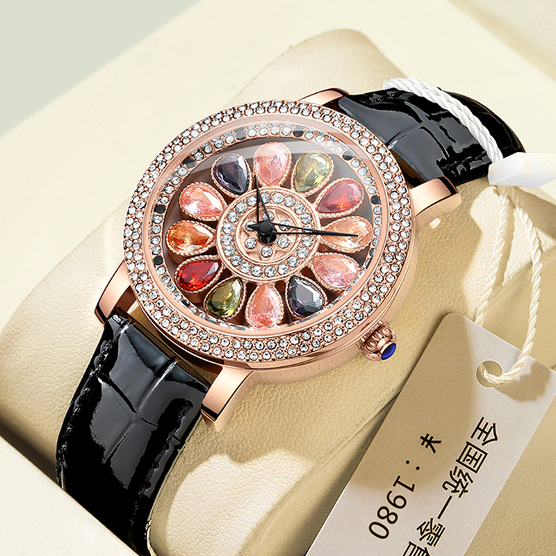腕時計の女性の時に回転するファッションの大きい文字板の満天の星の水のドリルの本革の気質の生放送の爆発金の2024