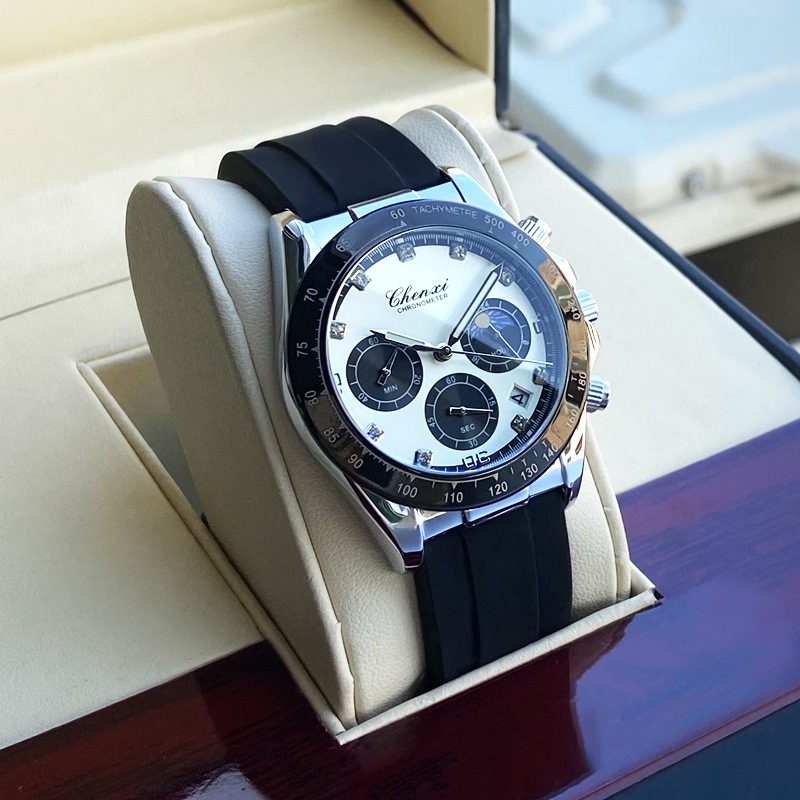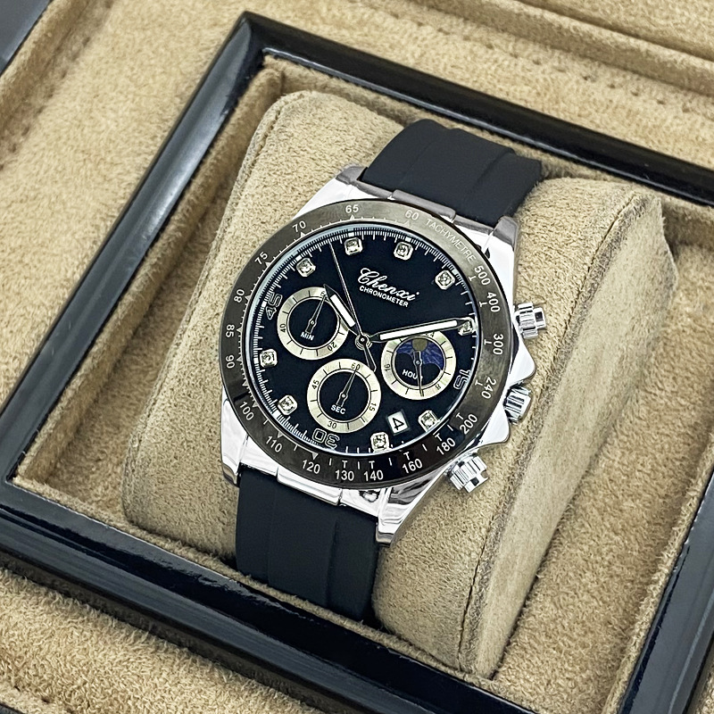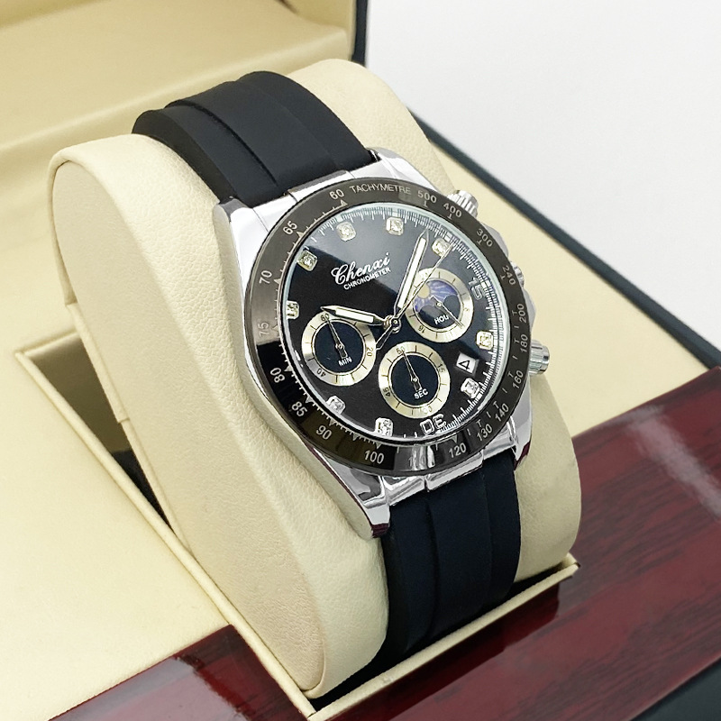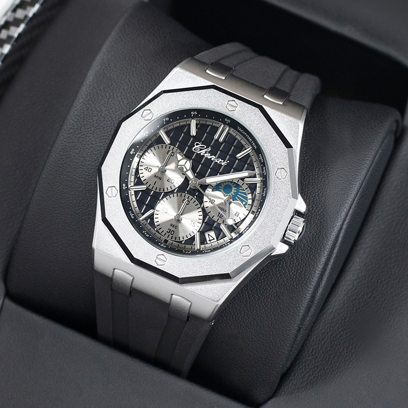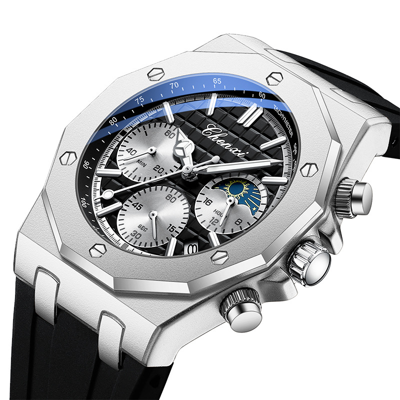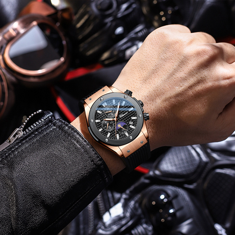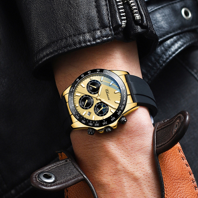 腕時計の男性の金の2024の新型のシリコンのテープの多機能の三眼の六針のファッションの防水の夜光のシンプルな日月の星